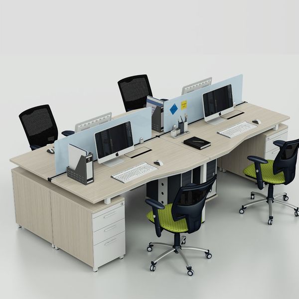 Bàn làm việc cụm 4 chỗ ngồi, kiểu dáng chữ Z, mặt ván gỗ MFC phủ melamine màu vân gỗ, chân sắt chữ V, là sắt hộp 40x40mm, kết hợp sắt 20x40mm, dày 1.2mm, sơn tĩnh điện.