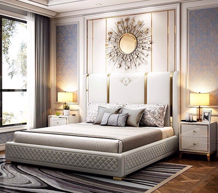 • Chất liệu bọc da simily cao cấp; Khung gỗ MDF chống ẩm theo tiêu chuẩn xuất khẩu, nệp viền inox mạ titan vàng