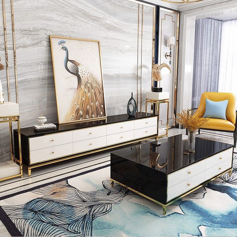 Thiết kế hai tầng gồm 6 ngăn kéo cung cấp không gian lưu trữ lớn, không gian trang trí, trưng bày và sắp xếp các đồ dùng phòng khách, sách báo, tivi, rượu, tranh ảnh, hoa lá cây....một cách khoa học, ngăn nắp